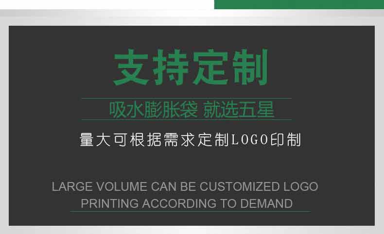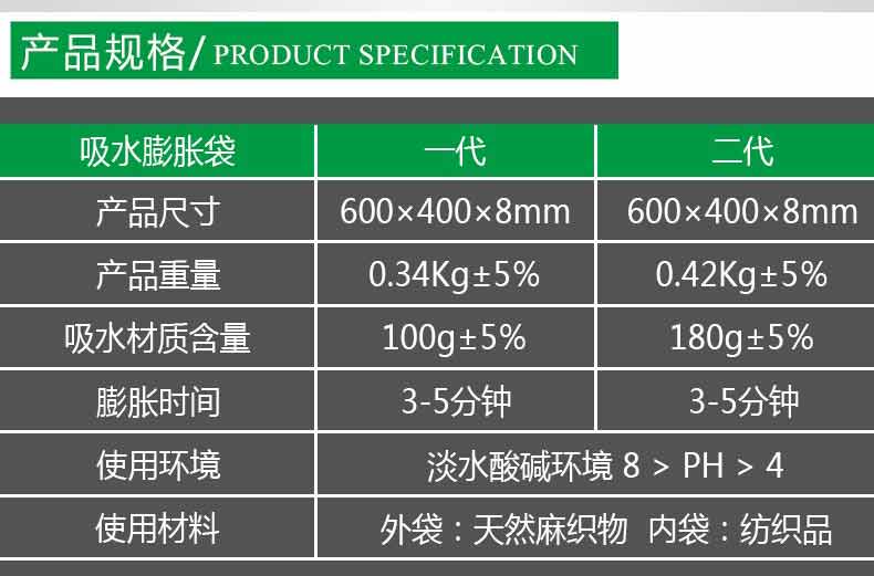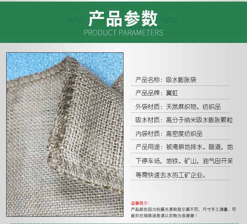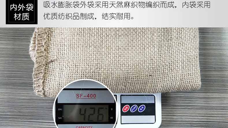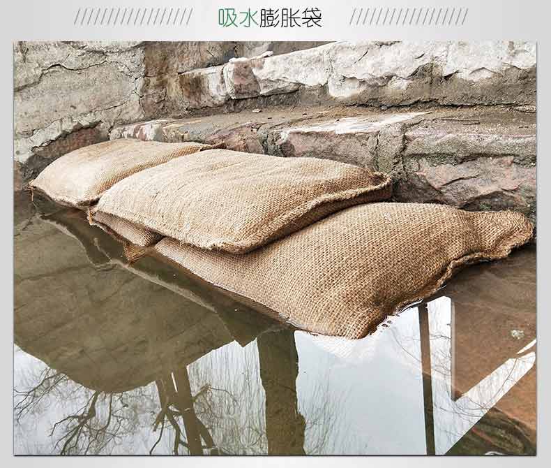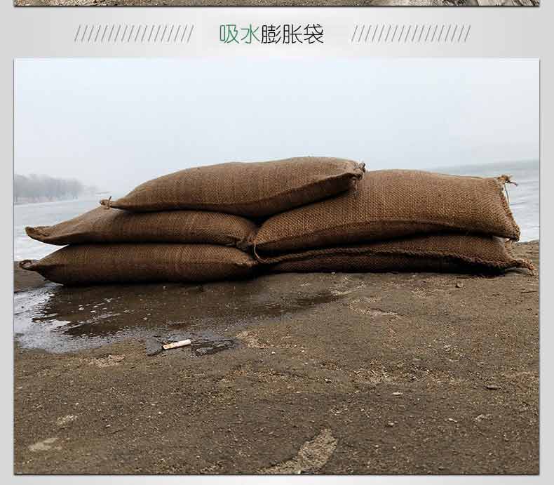 吸水膨脹袋內(nèi)裝的是新型的高分子納米吸水物質(zhì),這種物質(zhì)無毒、無味、無污染,吸水膨脹前為極小的顆粒物質(zhì),吸水后為黑豆大小的含水物質(zhì),干凈且無公害,待高分子吸水物質(zhì)使用后可用于農(nóng)業(yè)保水抗旱,所以在洪水過后可就地將袋內(nèi)的物質(zhì)傾倒入農(nóng)田中,在泥土中可完全分解,是綠色環(huán)保、一舉兩得的首選產(chǎn)品。外袋為純麻布和棉布織成,遇水后麻繩可更加結(jié)實(shí)耐磨。