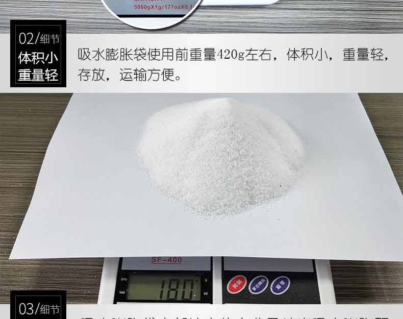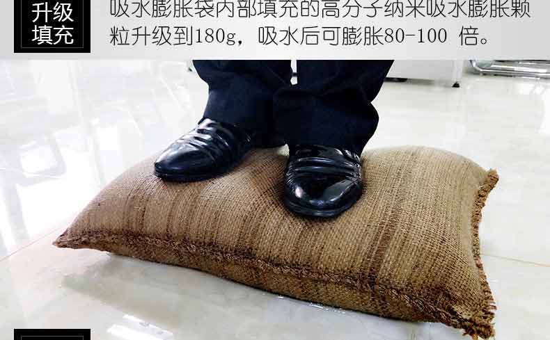 以水治水,快速膨脹,管涌以及快速構(gòu)筑擋水壩,封堵缺口,替代沙袋,替代沙袋和編織袋。操作簡單,攜帶運(yùn)輸方便,遇水膨脹速度快,浸入水中 3 分鐘即可迅速膨脹至 18 ~ 20 千克,吸水膨脹袋 經(jīng)現(xiàn)場測試比沙土包堵截速度快9倍,使用時(shí)只需一人就可以完成,勞動強(qiáng)度大為減輕,無毒,無害,無味,無污染,可自然降解