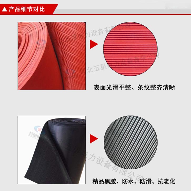 防滑絕緣膠墊產品分為防滑圓點、防滑條紋。 不含雜質:原生橡膠材質,不含次生膠,切面不會有粉末, 柔韌性好:具有優良的絕緣性能,彈性強,拉伸強度大 光澤度高:原生橡膠材質,無任何塑料成分,表面光澤度高 無氣泡:五星電力絕緣膠墊,表面無氣泡,無裂痕