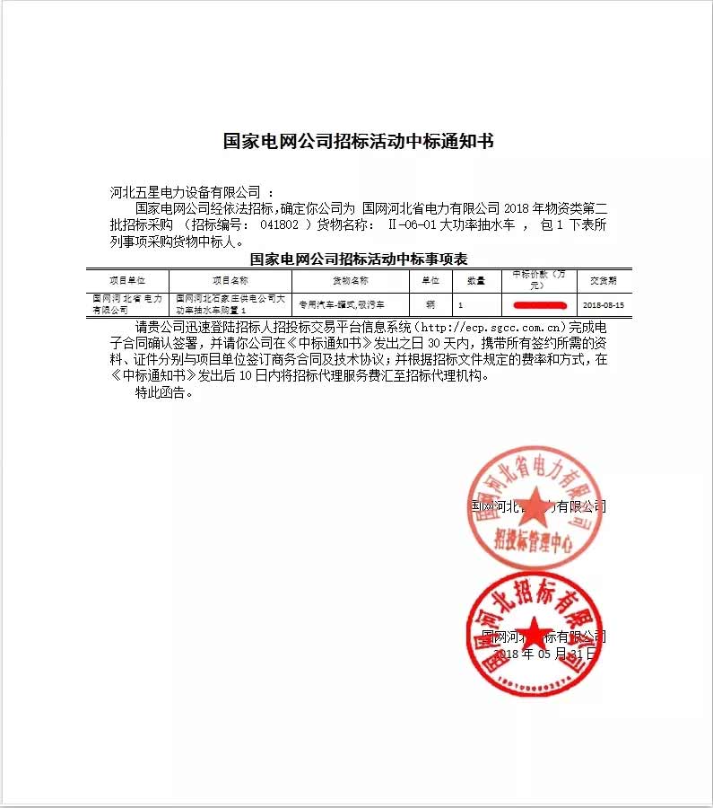 國家電網(wǎng)公司經(jīng)依法招標(biāo),確定河北五星公司為國網(wǎng)河北省電力有限公司“”2018 年物資類第二批招標(biāo)采購 (招標(biāo)編號: 041802 )”項目中,河北五星研制生產(chǎn)的“大流量應(yīng)急搶險排澇車”一舉中標(biāo)!!